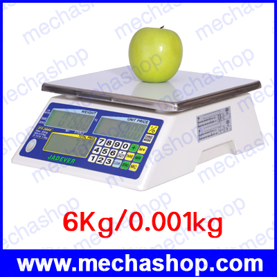 เครื่องชั่งดิจิตอล เครื่องชั่งคำนวณราคา 6kg ความละเอียด0.001kg หน้าจอแสดงผลLCD สีดำ ถาดชั่งเป็นสแตนเลส ขนาด 210x190mm ยี่ห้อ JADEVER (ไต้หวัน) ผ่านการตรวจรับรอง